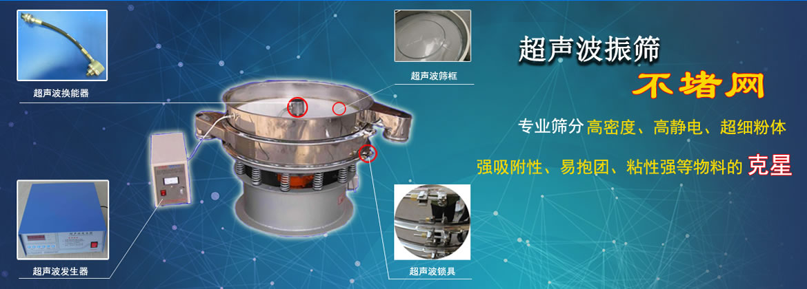超聲波振動篩是將220V、50Hz或110V、60Hz電能轉化為18KHz的高頻電能,輸入超聲換能器,將其變成18KHz機械振動,從而達到高效篩分和清網的目的,使超微細粉篩分成為易事。該系統在傳統的振動篩基礎上在篩網上引入一個低振幅、高頻率的超聲振動波(機械波),以改善超微細粉體的篩分性能。附加在篩網上的超聲振動波(機械波),使超微細粉體接受巨大的超聲加速度,從而抑制粘附、摩擦、平降、楔入等堵網因素,提高篩分效益和清網效益。特別適合高附加值精細粉體的用戶使用。