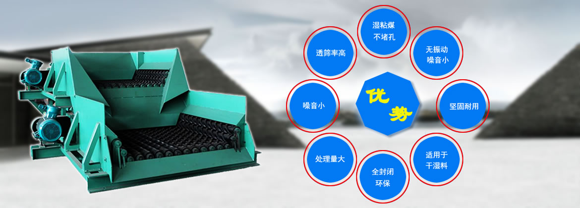 螺旋軸轉速較高,物料在篩面上的移動速度達0.5~1米/秒,因此該機處理能力大。同時當塊狀物料貼著螺桿表面滑動時,便能將沾附在其表面的濕粘粉末清洗掉。因此,無論多大水份的物料,經篩分后篩面總是清潔的,不會產生堵篩孔現象。另外在篩分物料時,物料總是處于螺旋軸徑向不同位置上,當螺旋軸旋轉時,由于物料的線速度各不相同,從而使物料松散透篩,再加上經過一段篩子篩分后進入第后進入第二段篩子時有落差,物料翻落滾動得到充分松散,更使其獲得充分的透篩機會,所以具有很高的篩分效率。這樣的工作原理,同幾十年來在篩選領域一統天下的振動類篩分設備有著本質的區別。后者靠振動篩面使物料拋起,分層透篩,但在遇到濕沾物料時,靠近篩面的粉末較易結餅夾層,堵塞篩孔,透篩就會非常困難。特別是8、10、13mm小規格的篩孔,堵篩更加嚴重,根本就無法實現篩選分級,另外,物料往前滑動的動力也是產生于篩面傾料后物料自身重力的下滑力,前移就非常被動和遲緩,效率低下,這類設備屬被動篩分,而前者是靠螺桿的旋轉,強制物料推進,篩孔為動態平移篩孔暢通無阻,因此具有高效性,屬主動篩分。再又由于構成篩孔的相鄰兩根螺桿在形成篩孔投影方向的線速度方向是相反的,物料受一對力偶作用成滾動移動,而不是受擠軋力作用,因此不會有新的煤塊破碎情況產生。